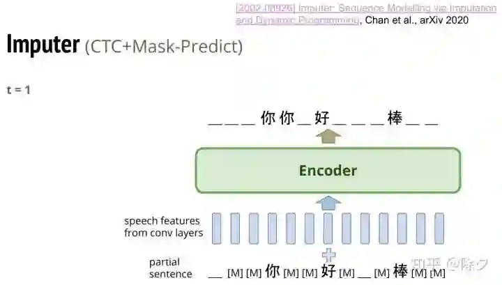 所以为了改良 CTC,就有了 Imputer。它的概念就是 CTC + Mask-Predict。这是一篇非常新的 paper。它的模型和 CTC 很像,不同在它输入的地方,会同时把文字的token序列也加进来。在 t=0 时刻,这个序列会全是 MASK tokens。就和在做 Mask-Predict 一样。输出需要模型把部分 MASK 换成真的字,也可以换成是 blank token。