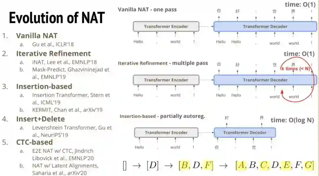 自从这篇 NAT 出来之后,之后几乎每个月都会不止一个新模型出现。第一个出来的变种是 Iterative Refinement 的思路是,如果我们让模型一口气输出整段话可能会太勉强,我们能不能把解码出的文本再重新丢回到解码器,重复多次让它来修正之前的错误。除此之外,还有一种方法是 Insertion-based,它类似于前面的变种,不过它迭代的方式是通过插入的方法。对于非自回归模型输出的比较差的句子,重新丢回解码器判断每两个字之间要不要插入新的词。因为原本的迭代优化的方法,句子长度是固定的。第一次解码出的句子多长,迭代优化后的句子也会是这个长度。但是用基于插入的方法,迭代优化的句子长度就可以改变。但这样还是会比较慢。比如我们想要生成 ABCDEFG,第一步可能会先生成中间的D,然后是 BDF,最后才是全部的tokens。最快是 O(logN) 的实践。所以基于插入的迭代优化法,比较像是介于自回归和非自回归模型中间的一个产物。有了插入之后,我们又会想到它插入了一个错字,它就不能再修改了。所以我们会自然地想到既可以插入又可以删除地迭代优化方法。最后一个就是 CTC-based 方法,这个和语音识别中的 CTC 是一致的。待会我们会详细介绍它要怎样应用。