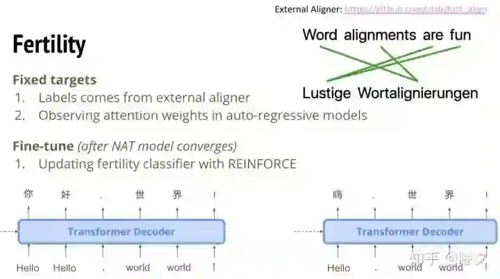 假如编码器输出的是 2121,Hello 复制两次,那它就可能输出一个 Hello 的 token 对应着 "你好" 两个中文 tokens。但如果编码器输出的是 1121,则 Hello 只有一次,它就只可能对应着中文的 "嗨" 一个token。除此以外,我们也可以直接去训练一个序列到序列的模型,然后去看它的注意力权重是怎样分布的。在语音处理中,对应的就是哪段语音信号对应的哪段文字。这里做的事情是一样的。但如果我们只是从外部得到答案,来端对端训练这个 Fertility 预测的话,它和最后模型要预测一句不错的句子目标是不一致的。所以我们在模型收敛以后,会做一个微调的步骤。就是用强化学习的损失加在 fertility 分类器上面,去优化。