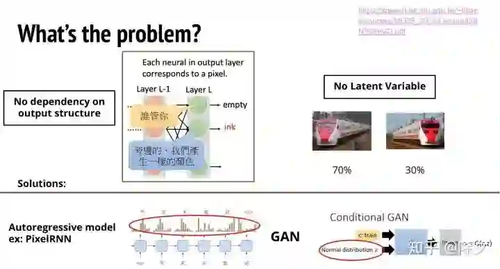 为什么我们会遇到这个问题?这是因为图像每个位置的像素都是独立输出的,没有考虑到彼此的依赖关系。如果我们用自回归模型去做,就可以避开这类问题。因为在输出第二个位置的像素时候,可以看到第一个位置的像素。另一种方法是用 GAN 来解这个问题。判别器能够给整张图片评分。然后把这个分数反馈给生成器去更新参数。这个分数得出是参照了整个图片所有的结构,考虑了不同位置的像素与像素之间的依赖关系。所以 GAN 是一种可以让生成器输出完整结构的方法。除了没有考虑不同输出的依赖问题外,这类依赖监督信息的模型也没有任何的随机机制,没有一个隐变量去决定输出的火车朝向左边还是右边。虽然这个模型在训练的过程中,已经知道有 70% 左右火车朝左。但由于它内部没有随机的机制,所以即使到了最后一层输出,它还是会输出两种朝向火车的叠加状态。为什么自回归模型不会有这类问题呢?这是因为它对每个时间点解码就会有个采样的过程。它会挑一个几率比较大的,把其它可能性都排除掉。对于 GAN 而言,不管有没有条件生成,输入给生成器的都会加一段随机的噪音。这段噪音实际上就是让模型实现决定好生成的方向。所以自回归模型 和 GAN 都会避开这两个问题。但是我们的非自回归序列生成模型,就会遇到这两个问题。