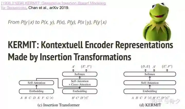 Insertion transformer 出来以后,又出了一篇叫 KERMIT 的论文。这个也是芝麻街的人物。为了凑名字,原本是 C 开头的 contextual 变成了德文的 Kontextuell。这个 KERMIT 的概念和 insertion transformer 的概念是一模一样的。唯一不同在, insertion transformer 有编码器和解码器。而 KERMIT 把编码器和解码器混合在同一个模型中了,就像 BERT 一样。比如我们要中文翻译英文,我们把中文和英文的序列接在一起,然后在英文的那半边做插入的操作就好了。