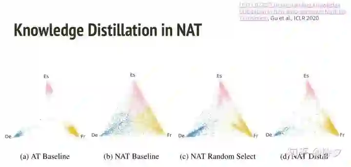 最后再提一下知识蒸馏在NAT中为什么有用。这篇2020的论文做了一个实验。任务是把英文翻译成西班牙文、法文、或德文。数据对随机匹配,模型不知道它要把英文翻译成哪种语言。我们让自回归模型去学这个任务的话,模型每次都分不清要翻译成什么语言。只要一吐出德文,它句子中所有字都会是德文的词汇。图中的每一个点就是它输出的一句话中,德文、西班牙文和法语的比例。要么就整句话都是德文,要么就整句话都是西班牙文或法文。就很难出现同一句话有三种不同的文字的句子。这也非常符合真实的数据分布。但如果我们用 NAT 非自回归序列生成模型去学,就发现它会出现一句话中出现不同语言文字的情况。如果我们把数据集中,存在一句英文对应到三种翻译的句子,随机删除掉英文到另外两种语言的数据对。我们互发现,之前的问题就会减轻。可是我们发现更有效的是,我们直接让 NAT 模型去学自回归语言模型的输出,即做知识蒸馏。这个状况可以减轻得更多。所以说知识蒸馏在 NAT 中的作用很大。