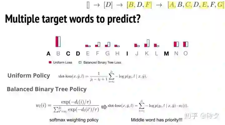 假如一个槽位有很多个字的话,我们就要把全部的损失都计算。原本我们这些字的所有的损失相加求平均。但我们可以让模型倾向于生成出槽位靠中间的字。为什么要这样做呢?因为在迭代的过程中,先生成出中间的字,可以方便下一次迭代生成补全。这样迭代的次数就会尽可能的少。所以我们可以针对中间的字算损失的时候,乘上一个比较大的权重,让模型更倾向于先把中间的字生成出来。