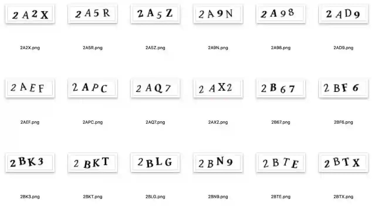 为了训练机器学习系统,我们首先需要训练数据。而为了破解CAPTCHA系统,我们需要的训练数据应该长这样: