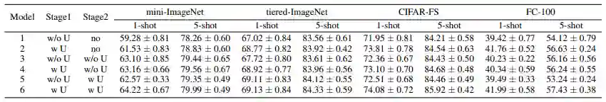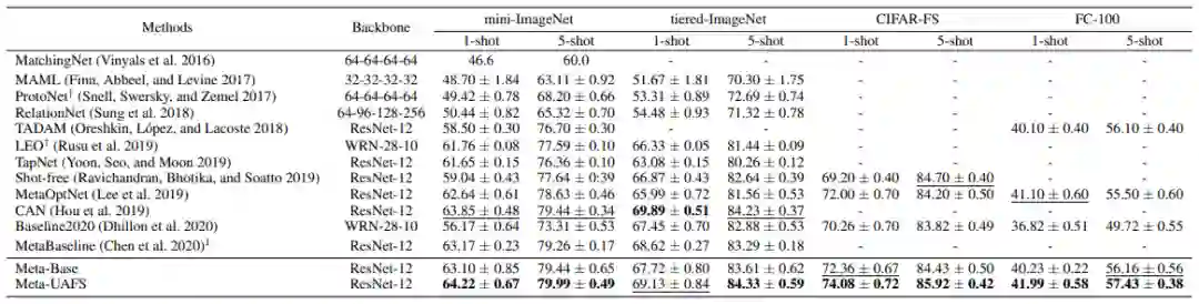 与 SOTA 方法的性能对比:研究员们在 mini-ImageNet、tiered-ImageNet、CIFAR-FS 和 FC-100 四个通用小样本图像分类数据集上,将所提出的不确定性感知小样本图像分类模型与 SOTA 方法进行性能对比,实验结果如表3所示。实验证明了本文提出的方法在大多数情况下均能超过已有 SOTA 方法。