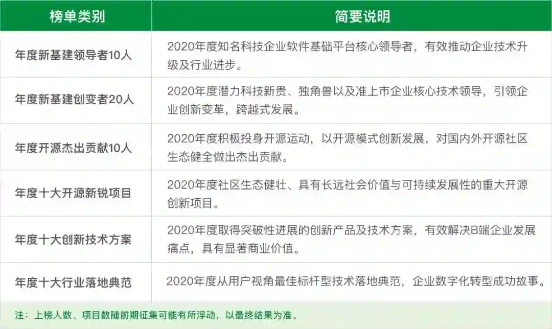 本次「创新优选」主要面向在华开展业务布局的国内外科技企业,重点聚焦“数字基建”以及“开源创新”两大领域,通过采访、调研、专家举荐以及三方数据合作等形式,综合评选产生新基建领导者、新基建创变者、创新技术方案、行业落地典范、影响力开源项目系列榜单。