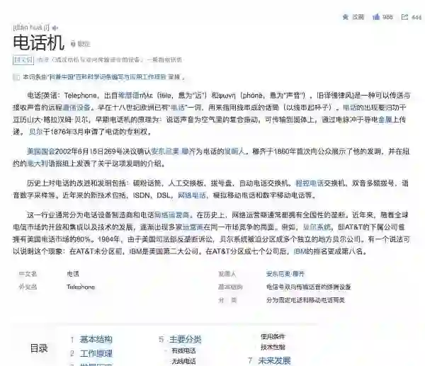 反面教材:百度百科页面中对大量的特定词进行标记,影响了对“电话机”一词(页面主旨)的信息理解,也在美学上带来了视觉噪音。这种方式是不适用于需要强理解的页面的。