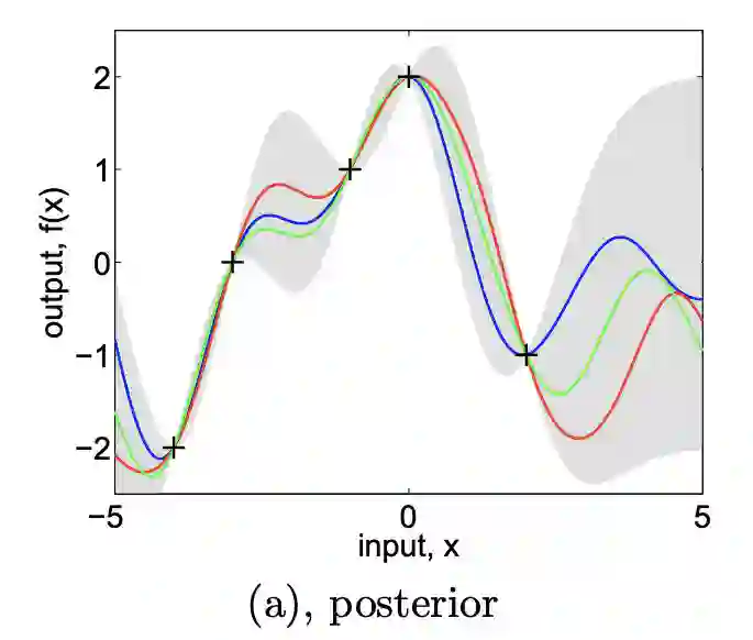 上述公式中,C 是核函数(kernel function),也叫协方差函数(covariance function),另外 C 有两个超参数 需要人工设定或者从数据集中学习、估计。e 代表观测的高斯噪声。以下我们假设 f 的均值函数(mean function)是 0。 GP 的优势主要是因为他是 Infinite-dimensional 模型。怎么理解呢?设想神经网络,其网络权值需要从数据中学习,而且学到的值是 deterministic 固定的。而 GP 是 non-parametric,从数据中学到是一个分布,是一个关于函数的后验分布,因此包含无限种取值可能性。但相应的,这牺牲了 GP 的计算复杂度。