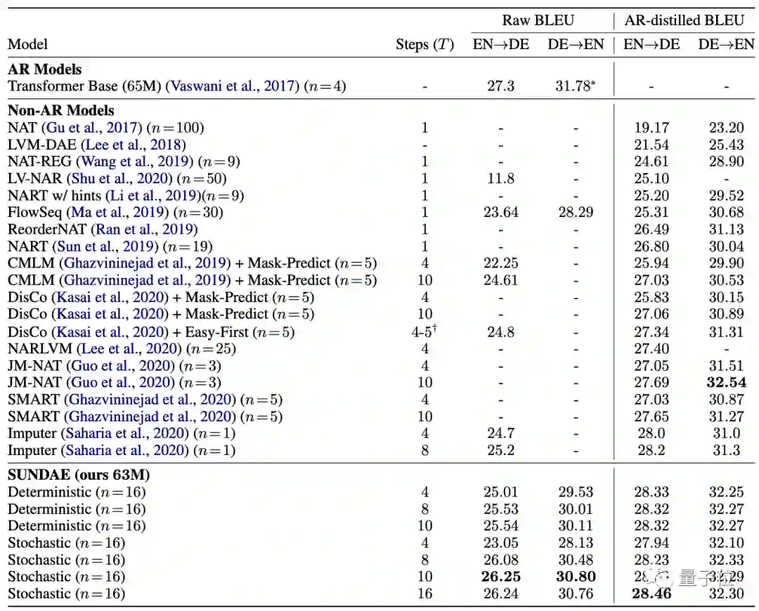 结果发现,在不使用序列级知识蒸馏等技术的情况下,“圣代”的性能几乎与AR模型相当,并且打败了所有非AR模型。