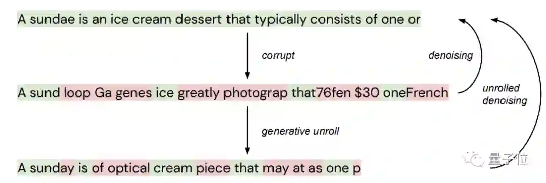 与降噪扩散技术(denoising diffusion)类似,“圣代”在训练期间采用展开降噪(unrolled denoising),将一系列token重复应用,从随机输入开始,每次都对其进行改进,直至收敛。