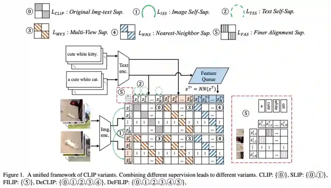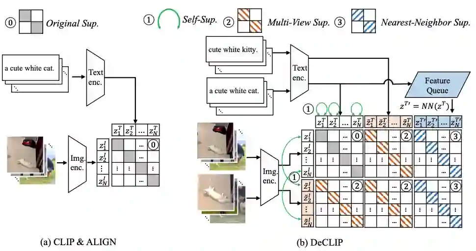 大规模语言-图像对比学习预训练已经在零样本学习以及下游任务上取得很好的效果(如CLIP)。但是例如CLIP这样的模型需要400M的数据进行预训练,为了提高训练的效率,让模型在较少的训练数据下依然取得不错的效果,本文提出一种高效的多模态预训练范式DeCLIP。不同于CLIP仅仅使用图像文本对匹配作为自监督信号,DeCLIP使用了多种监督信号: