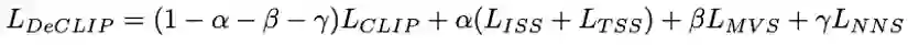 原始的CLIP直接使用图像和文本的嵌入计算自监督InfoNCE损失,而DeCLIP中使用的是数据增强后的文本和图像,进行四次InfoNCE,相比CLIP多了三倍的量。具体来说,对于原始图像文本对,DeCLIP将图像进行数据增强得到
