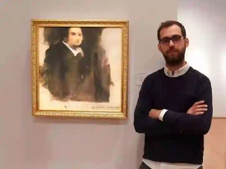 (皮埃尔·福特尔(Pierre Fautrel)是利用人工智能创作艺术品的法国企业家团队的联合创始人,他旁边的画作是算法创作的艺术品)