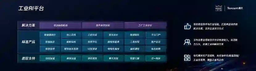 面向传统行业的工业 AI 平台则可以快速满足工业领域的缺陷检测、备件拍照识别、工厂工效优化等客户需求。并提供数据管理、在线训练、效果评估、业务编排等全过程个性化训练服务,满足上述场景的差异化需求。平台支持私有化及公有云部署,提供业界领先的加速、调度与容器服务,以更少的硬件资源支持更复杂的业务。