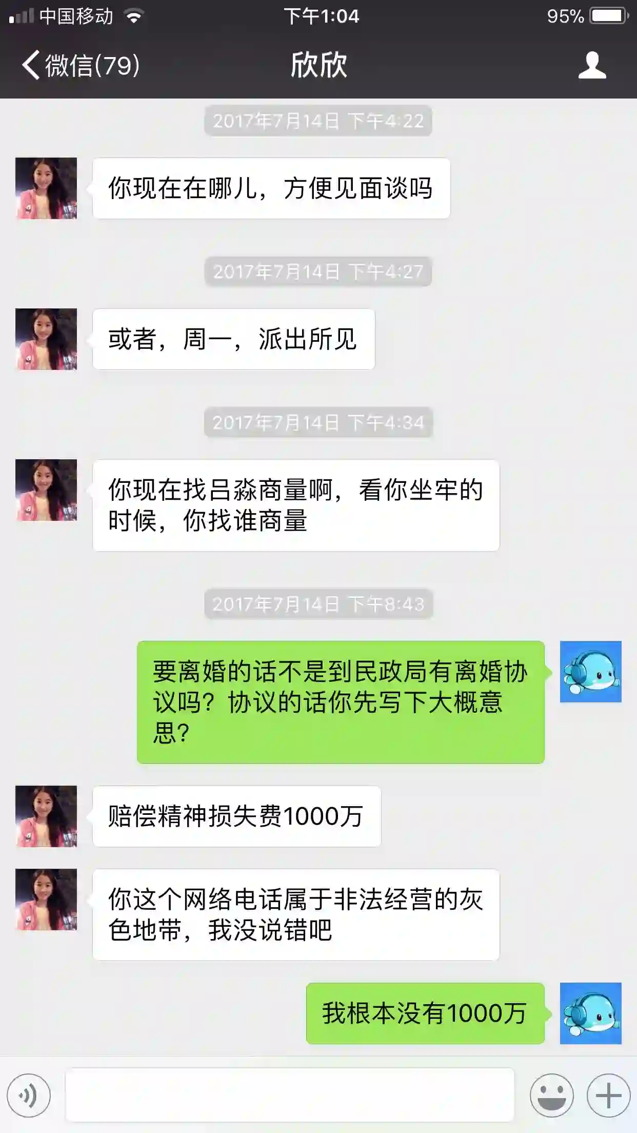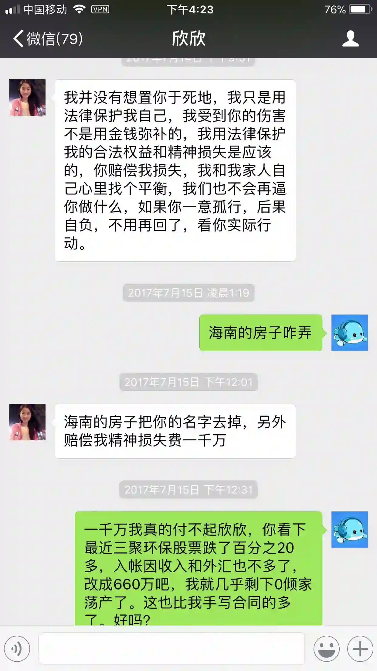 她竟然索要1000万天价还有三亚的房子归她。还请了个素质极低的流氓律师各种恐吓我。