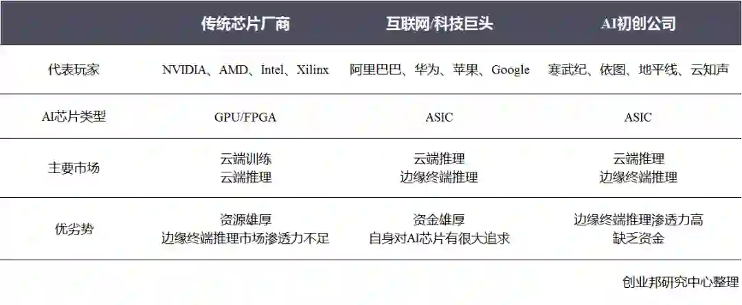 传统的芯片制造厂商:Intel,Nvidia 和AMD。他们的优势在于在已有架构上对人工智能的延伸,对于硬件的理解会优于竞争对手,但也会困顿于架构的囹圄;科技/互联网巨头在科技上层生态的构建者进入芯片设计,比如苹果、Google和阿里巴巴,优势在于根据生态灵活开发定制各类ASIC,专用性强;AI初创公司,某些全新的架构比如神经网络芯片的寒武纪,因为是全新的市场开拓,具有后发先至的可能。