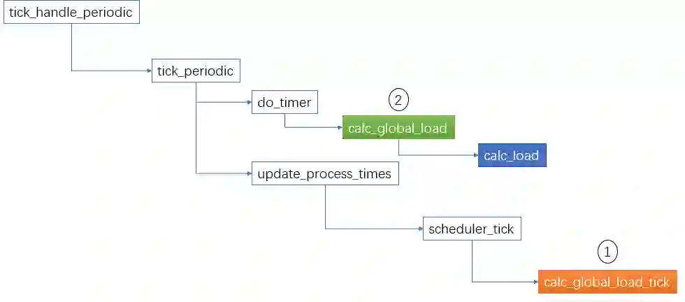 上图中,棕色的calc_global_load_tick函数就是完成第一个步骤的,绿色的calc_global_load 是完成第二个步骤,蓝色的calc_load 就是上一节中描述的核心算法。