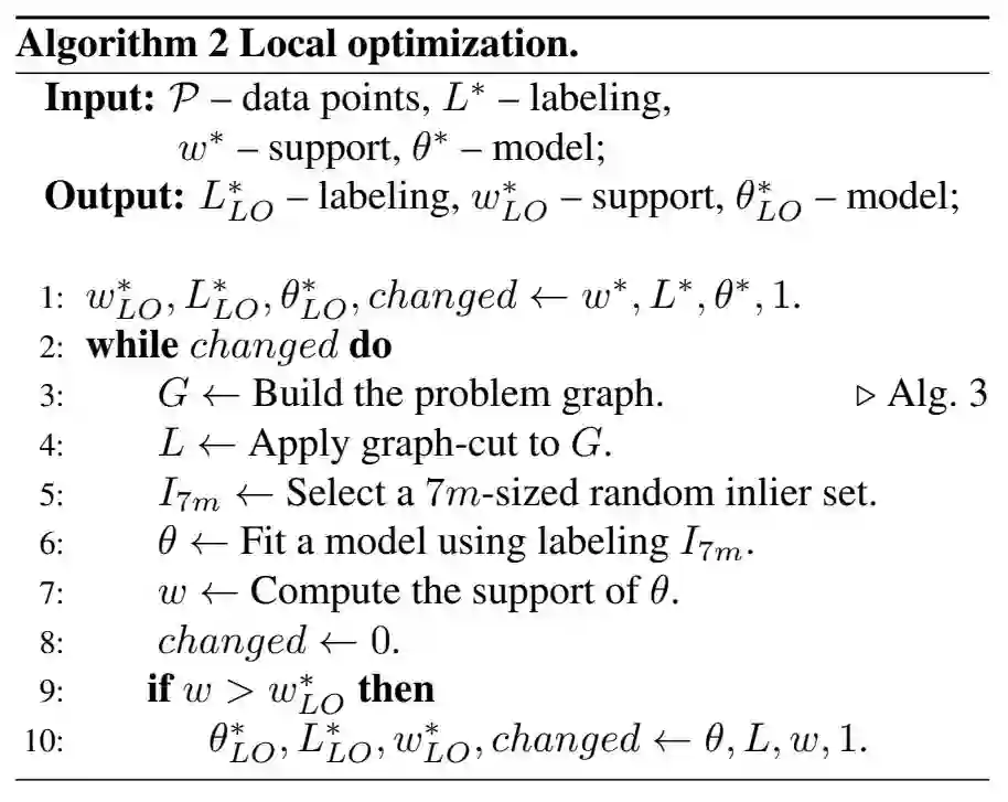 本文提出了一种新的鲁棒估计算法,叫做图割RANSAC,简称GC-RANSAC。当找到当前最好模型时,该算法在局部优化中使用图割算法来区分内点和野点。本文提出的局部优化算法理论简洁、易于实现,是全局最优解且效率高。
