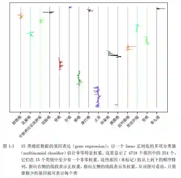 第 3 章会在这些数据上采用基于 lasso 正则化(lasso-regularized)的多项分类 器来实现该目标。这会对 15 个类中的每一个生成 4718 个权重(或系数),以便在 测试时进行区分。由于采用了 f1 惩罚,这些权重仅有一部分不为零(这取决于正则 化参数的选取)。可通过交叉验证(cross-validated)来估计最优的正则化参数,图 1-1 显示了由此所得的权重。图中仅有 254 个基因有非零的权重。对该分类器进行 的交叉验证,所得误差率约为 10%。也就是说,它能正确预测 90%的样本类别。相 比之下,使用所有特征的标准支持向量机误差率(13%)稍高一些。lasso 所具有的 稀疏性会在不牺牲精度的情况下大幅减少特征数量。稀疏性也提高了计算效率:虽 然可能要估计 4178 × 15 ≈ 70 000 个参数,但图 1-1 的整个计算在一个普通笔记本 上不到一分钟就可完成。第 3 章和第 5 章所介绍的 glmnet 程序包可以完成相关计 算。
