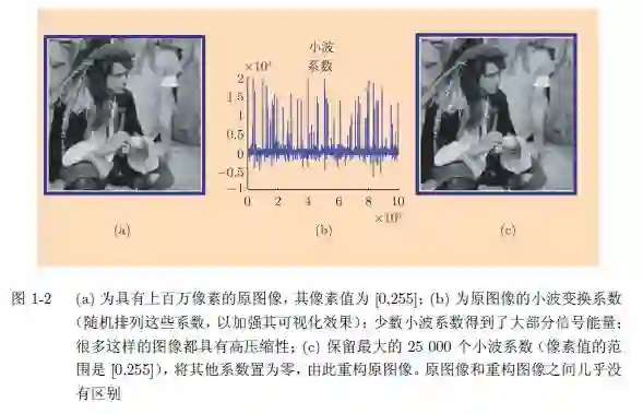 图 1-2 展示了另一个例子(Cand`es and Wakin 2008),属于压缩感知(compressed sensing)领域。图 1-2a 是一幅具有上百万像素的图像。为了节省存储空间,图像 可用小波基(wavelet basis)来表示,见图 1-2b。将最大的 25 000 个系数保留下来, 其余的全部置为零,图 1-2c 是基于这些系数重构的图像,效果非常不错。这一切 都归功于稀疏性:虽然图像看似复杂,但只有相对较少的小波基系数不为零。仅用 96 000 个不相关度量(incoherent measurement),原图像就可被完全恢复。压缩感 知是一种强大的图像分析工具,详见第 10 章。