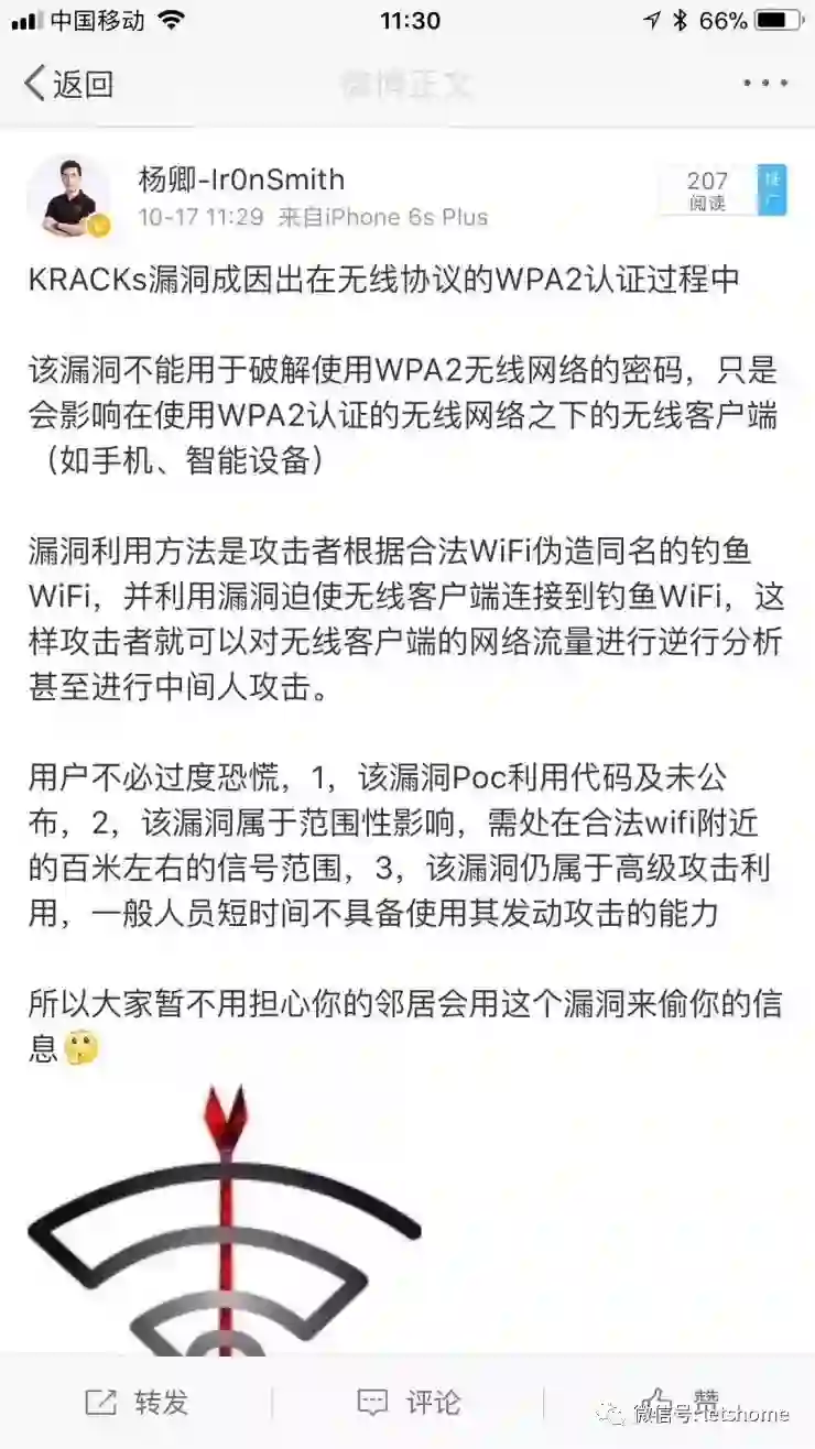 10月16日,雷锋网曾报道,用于保护无线路由器和联网设备不被入侵的 WPA2 安全加密协议,应该已经被破解了!利用这些漏洞的影响包括解密、数据包重播、TCP 连接劫持、HTTP内容注入等。意思就是,只要你的设备连上了WiFi,都有可能被攻击。