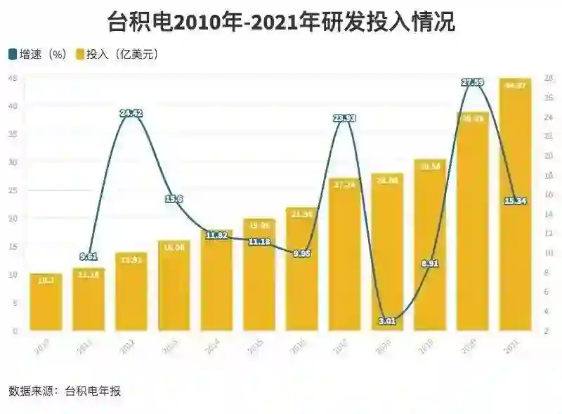 根据财经十一人的资料,台积电的研发投入基本在稳步上升,研发增速基本上每2到3年就会有一个高点,这与其进入下一个制程的量产有关。