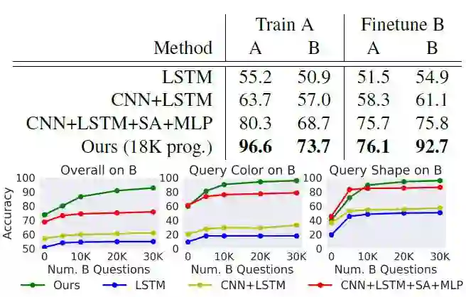 图 5 上表:研究者们用条件 A 训练了模型,随后在条件 A 和条件 B 下测试模型的性能。然后,研究者们将这些模型在条件 B 中用 3000 个图片和 30,000 个问题进行了微调,再在 A、B 条件中进行了测试。新模型在条件 A 中使用了 18,000 个程序,而在条件 B 的微调中没有使用任何程序。最后,他们研究了在条件 B 上进行微调时使用不同数量的数据的影响。