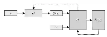 GAN的主要思想是设置一个零和博弈,通过两个玩家的对抗实现学习。博弈中的一名玩家称为生成器,它的主要工作是生成样本,并尽量使得其看上去与训练样本一致。另外一名玩家称为判别器,它的目的是准确判断输入样本是否属于真实的训练样本。一个常见的比喻是将这两个网络想象成伪钞制造者与警察。GAN的训练过程类似于伪钞制造者尽可能提高伪钞制作水平以骗过警察,而警察则不断提高鉴别能力以识别伪钞。随着GAN的不断训练,伪钞制造者与警察的能力都会不断提高[14]。