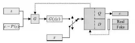 InfoGAN[51]发展了这种思想。通过引入互信息量,InfoGAN不仅免去了使用标注数据的必要性,还使得GAN的行为具有了一定的可解释性。InfoGAN的结构如图5所示。