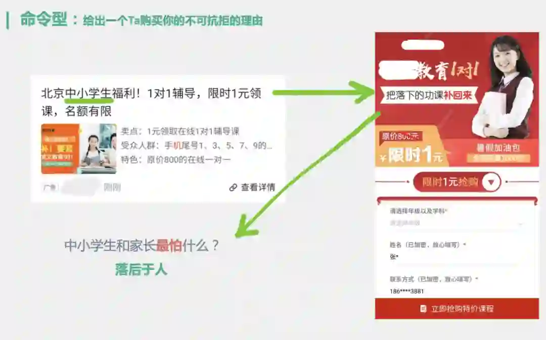 大家来看这个案例:上图是一个K12的广告,落地页的副标题,以一种很强势的语气和你说,你需要把拉下的功课补回来。语气和班主任一样,让家长都无力反抗。