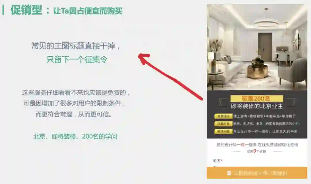 看一个比较有趣的案例:上图是一个北京家装品牌的落地页,这个落地页甚至没有常规意义上的主标题,为了突出有利可让用户图,做成了一个征集令的形式。