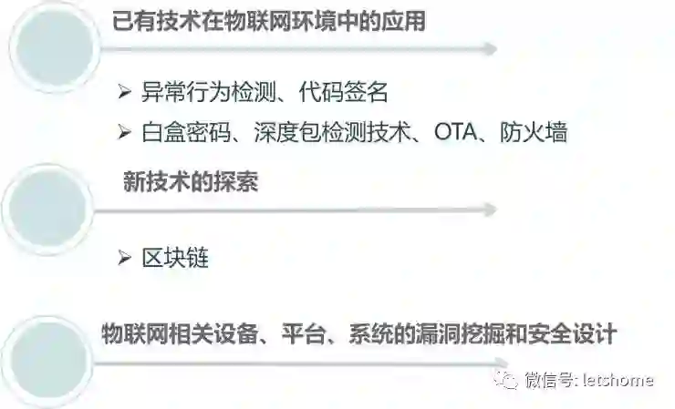 通过对物联网安全需求和对策的分析,我们总结出以下需要重点关注的技术,下面分别从已有技术在物联网环境中的应用、新技术的探索和物联网相关设备、平台、系统的漏洞挖掘和安全设计三个方面介绍物联网安全技术研究的一些思路。