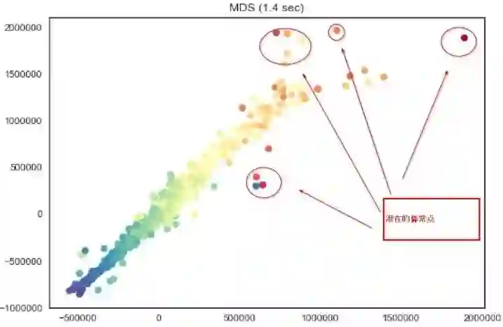 以我最近做的一个项目为例,我们用MDS将一个8维的数据在2维上展示出来。我们似乎可以直观的看到一些近似线性的关系,以及一些看起来“很可疑”的点,我在图中标注了出来。