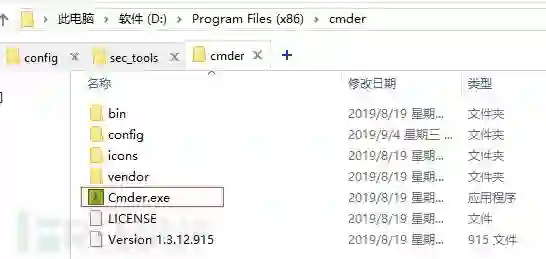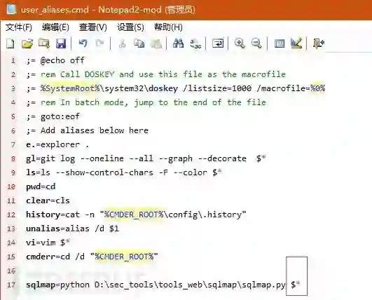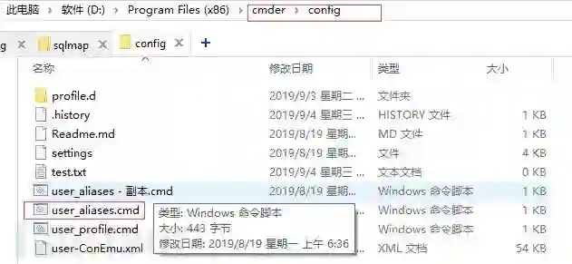 已经放好了,现在在cmder中还不能用,下面需要创建一条sqlmap命令,说是创建只是给咱们的sqlmap启动添加个别名 因为启动sqlmap的命令是 python sqlmap.py,咱们的sqlmap是在D:\sec_tools\tools_web\sqlmap,所以咱们本地的sqlmap启动命令是python D:\sec_tools\tools_web\sqlmap\sqlmap.py,打开cmder的配置命令别名文件,在cmder的config目录下的