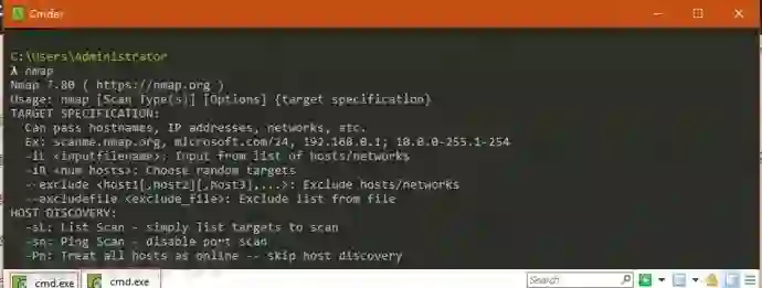 如果你在本地安装了nmap和msf什么的,在cmder中可以直接用的,下面来个nmap的截图:
