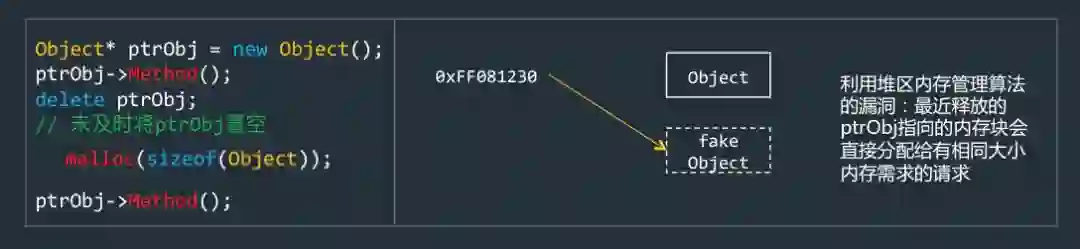 在上面的场景中,如果攻击者在delete对象后,马上又new一个同样内存大小的对象,在现代操作系统的堆内存管理算法中,会有很大概率将这个新的对象放置于刚刚被delete的对象的位置处。这个时候还通过原来对象的指针去访问,将出现鸠占鹊巢,出现可怕的后果。