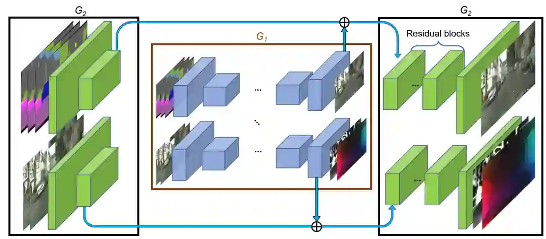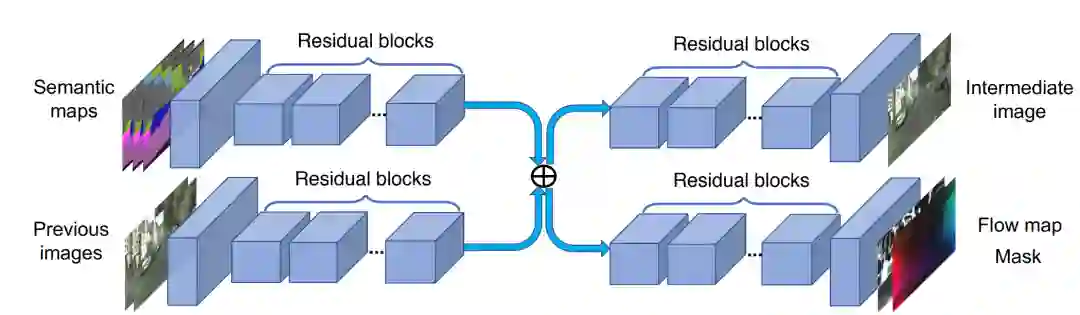 图6. 用于低分辨率视频的网络架构(G1)。网络接收一些语义标签图和先前生成的图像,并输出中间帧以及流程图和mask