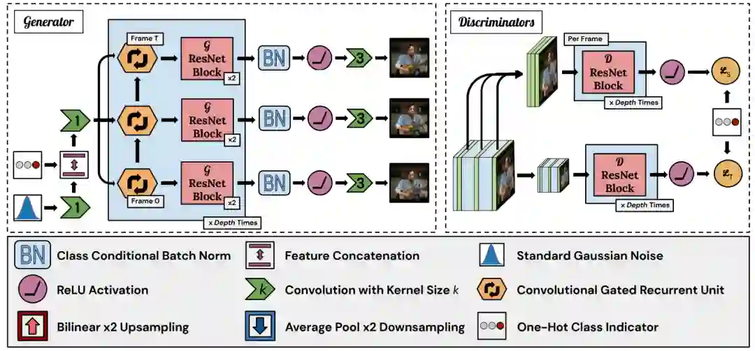 DVDGAN是一个建立在最先进的BigGAN架构上的复杂人类行为的生成性视频模型,同时引入了可扩展的、针对视频的生成器和鉴别器架构。其生成器不包含前景、背景或运动(光流)等明确先验;相反,依靠一个高容量的神经网络以数据驱动的方式来学习这些。虽然DVD-GAN包含序列组件(RNNs),但它在时间和空间上都不是自回归的。换句话说,每一帧的像素并不直接取决于视频中的其他像素,就像自动回归模型或每次生成一帧的模型那样。