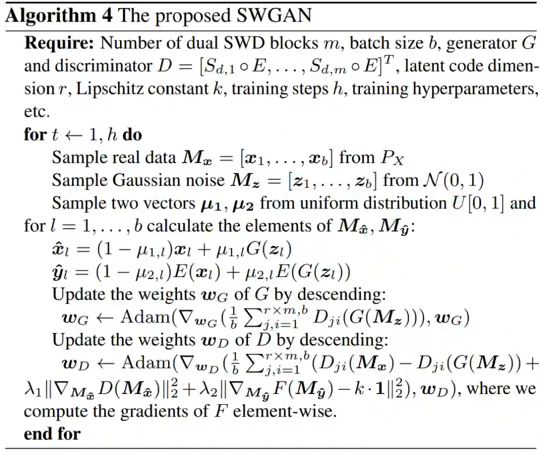 为了满足1-Lipschitz约束,给鉴别器中的所有线性层添加一个约束,以满足权重参数W的spectral norm 等于或小于1。这意味着权重矩阵的奇异值都是1或小于1。在参数更新后进行奇异值分解(SVD),将所有大于1的奇异值替换为1,然后用它们重建参数。将同样的操作也应用于卷积层,将权重参数中的高阶张量解释为一个矩阵Wˆ,称这些操作为奇异值剪切(Singular Value Clipping,SVC)。