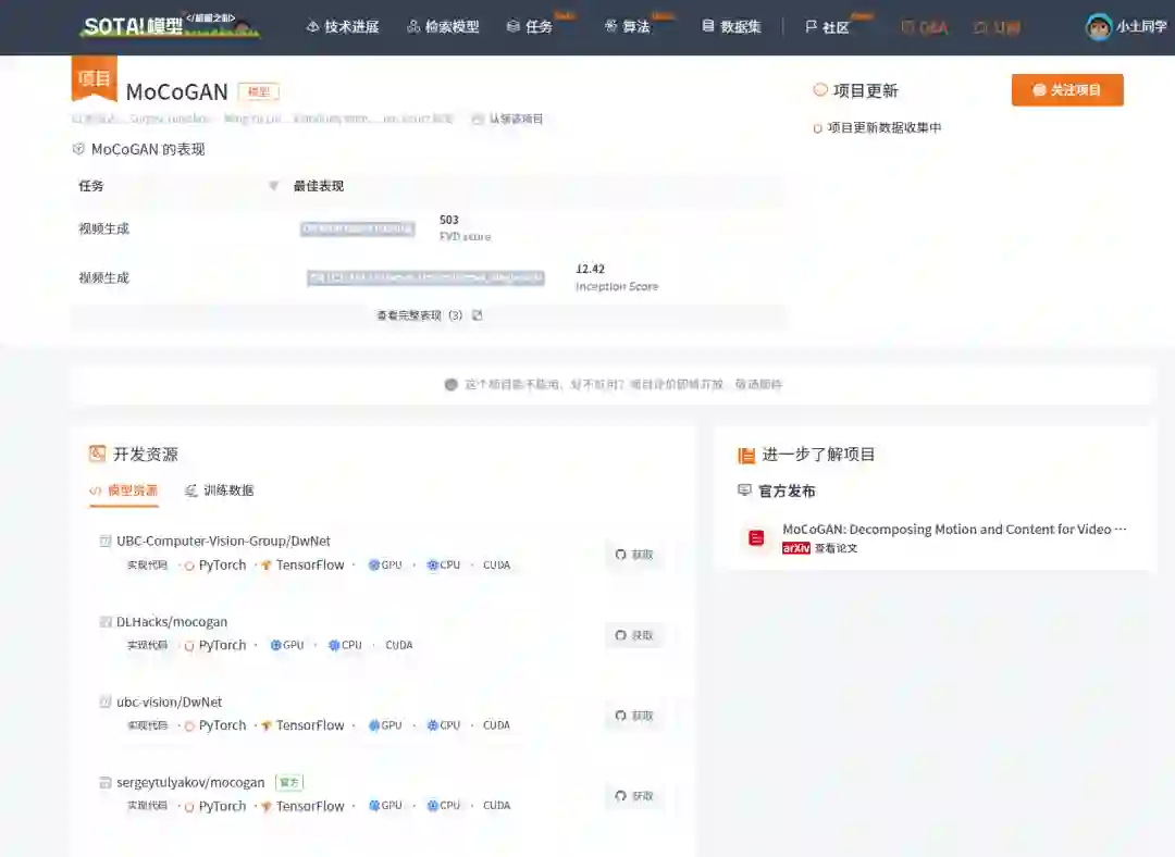 当前 SOTA!平台收录 MoCoGAN 共 4 个模型实现资源。