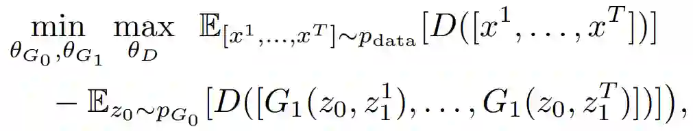 其中x_t是数据集中视频的第t帧,(z_1)^t是G_0(z_0)生成的第t帧对应的潜在变量。θ_D、θ_G0、θ_G1分别表示D、G0、G1的参数。