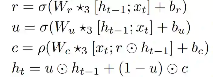 G的层常数对于64×64的视频来说是[8, 8, 8, 4, 2],对于128×128来说是[8, 8, 8, 4, 2, 1]。第i层的宽度由ch和第i个常数的乘积给出,在G的残差网络之前的所有层都使用初始层的乘积,把它和ch的乘积称为ch0。对于64×64分辨率的视频,DVD-GAN中的ch为128,否则为96。对于64×64分辨率的视频,DT和DS的相应ch列表为[2, 4, 8, 16, 16],对于128×128的视频,则为[1, 2, 4, 8, 16, 16]。G的输入包括一个高斯潜在噪声z∼N(0, I)和一个所需类别y的学习线性嵌入e(y),两个输入都是120维的向量。G开始计算[z; e(y)]到[4, 4, ch0]形张量的仿射变换(在图10中表示为1×1卷积)。[z; e(y)]被用作整个G的所有类别条件下的批量归一化层的输入。然后将其作为卷积门控递归单元的输入(在我们想要生成的每一帧),该单元对输入x_t和先前输出h_t-1的更新规则如下