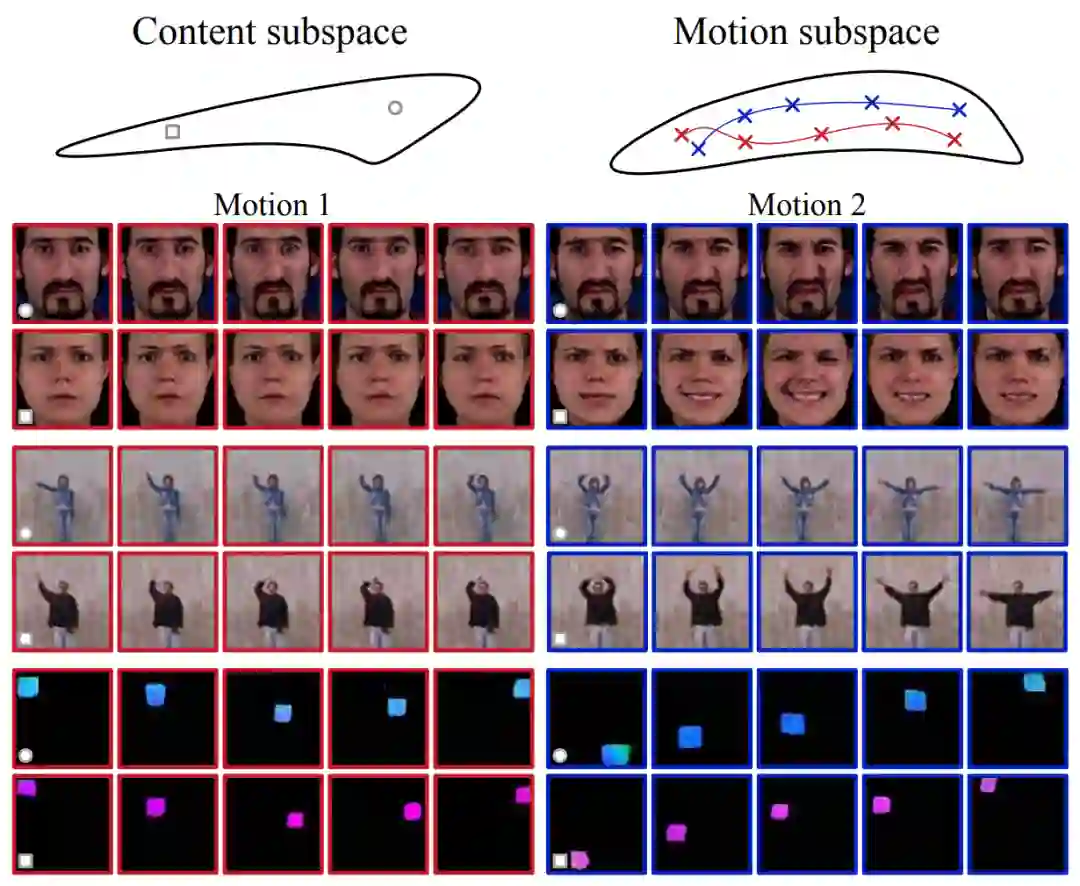 图3. MoCoGAN采用了运动和内容分解的表示方法来生成视频。它使用一个图像潜在空间(每个潜在变量代表一个图像)并将潜在空间划分为内容和运动子空间。通过对内容子空间中的一个点进行采样并对运动子空间中的不同轨迹进行采样,可以生成同一物体的不同运动的视频。通过对内容子空间中的不同点和运动子空间中的相同运动轨迹进行采样,可以生成不同物体做相同运动的视频