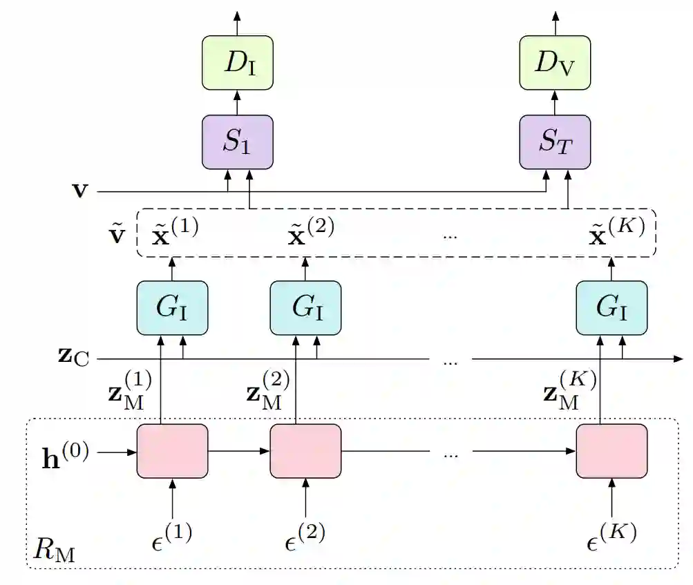 图4. 用于视频生成的MoCoGAN框架。对于一个视频,内容向量zC被采样一次并固定下来。然后,采样一系列随机变量并通过递归神经网络映射到一系列运动代码[z(1)M, ..., z(K)M]。生成器GI使用内容和运动向量{zC, z(k)M}产生一个帧,x˜(k)。鉴别器,DI和DV,分别从训练集v和生成集v˜中取样,对真实和虚假的图像和视频进行训练。函数S1从视频中取样一个单帧,ST取样T个相关的帧
