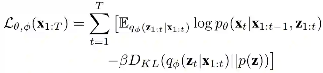 encoder学习的latent vector的概率分布不再是基于当前样本的p(z|x) , 而是相对于一个序列p(z_t|x_(1:t)) 。这部分通过 LSTM实现。用于decoder的不再仅仅是重采样得到的latent vector,同时还有前一帧通过encoder得到的特征。decoder学习的也不再是基于当前latent vector的数据分布,而是基于一个latent vector序列的分布p(xt|x_(1:t−1),z_(1:t))。因此, 要优化这样一个修改版的VAE,其变分下界具有如下形式: