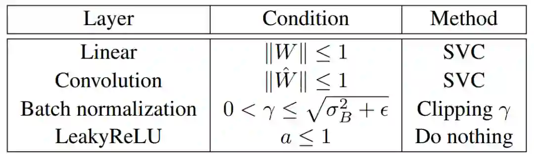 表2. 满足1-Lipschitz约束的方法。|| · ||表示 a spectral norm 。a表示LeakyReLU层的固定参数。γ和σ_B分别是批量归一化后的比例参数和一个批量的标准差的运行平均值