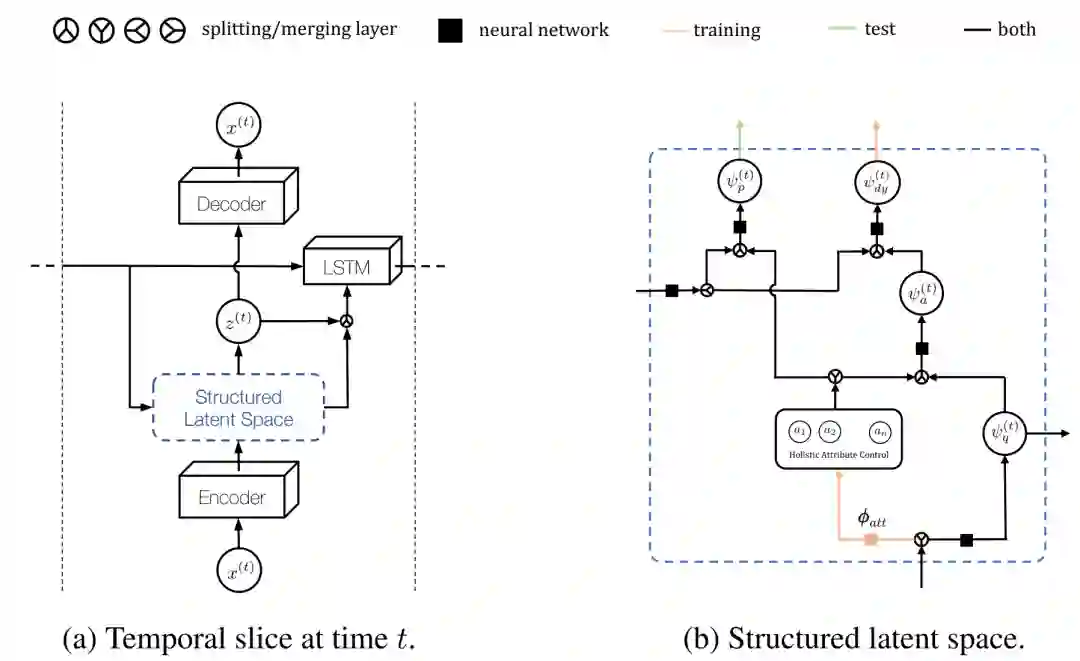 图9. VideoVAE概述,(a) VAE的结构化潜在表示编码了一个条件近似后验,在LSTM的帮助下通过时间传播。(b) 图9a中虚线框的详细说明:在一个分层过程中,整体属性首先与变异近似后验合并,然后与来自LSTM的时间信息整合,有效地产生了一个双条件动态近似后验