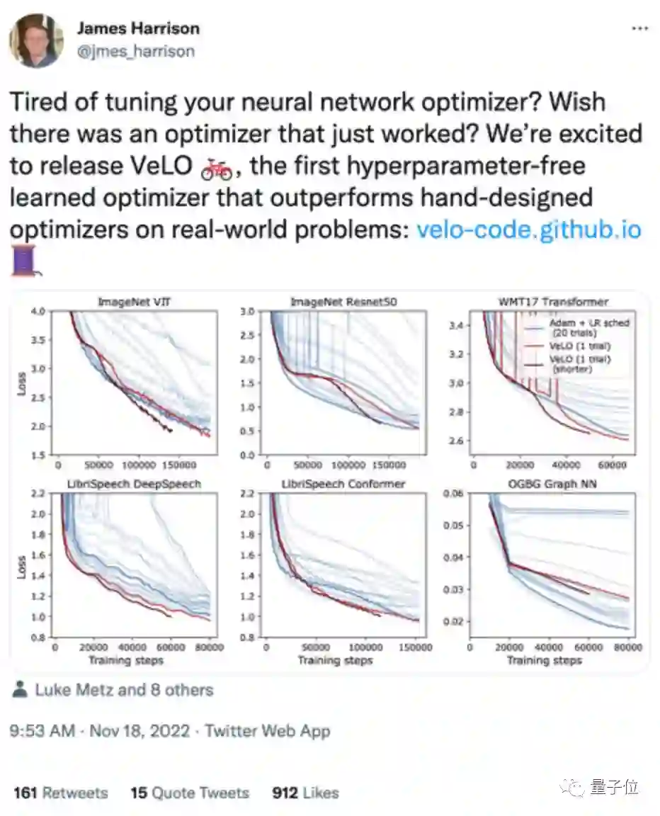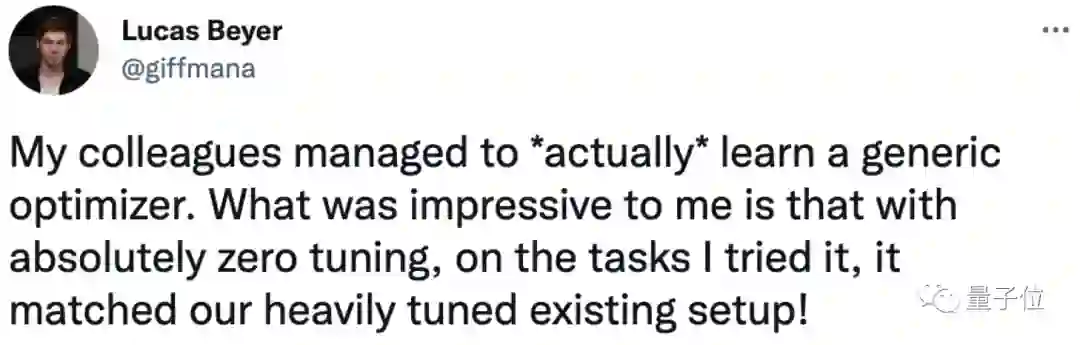 当然,效果也更好。论文作者之一Lucas Beyer将VeLO与其他“重度”调参的优化器进行了对比,性能不相上下: