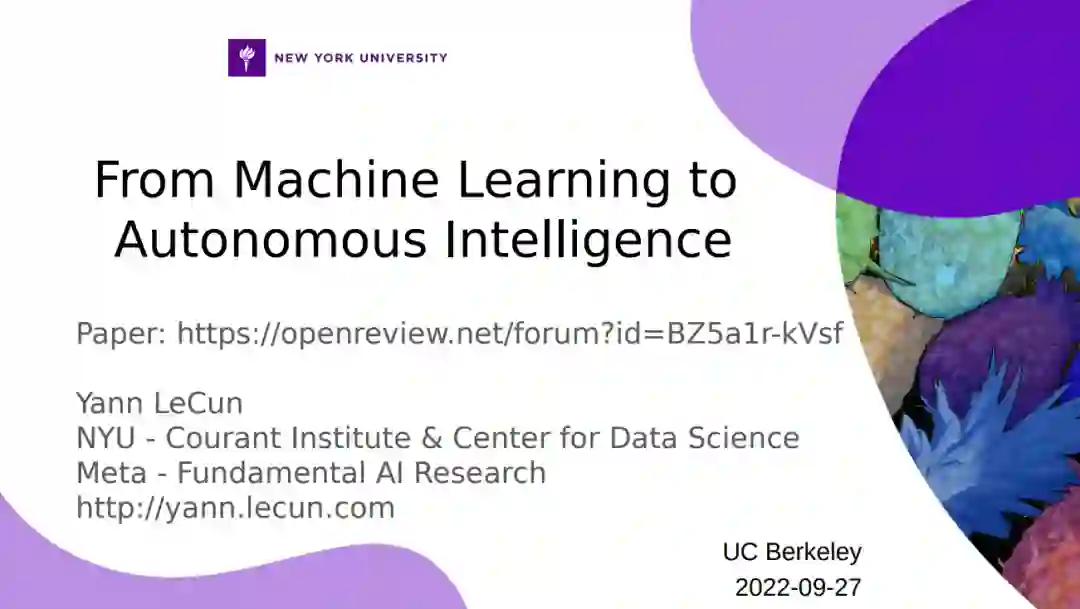在演讲中,Yann LeCun将基于一种新的模块化认知架构和一种有点新的自监督训练范式,提出一种通向自主智能agent的可能路径。提出的体系结构的核心是一个可配置的预测世界模型,它允许智能体进行计划。行为和学习是由一组可微的内在成本函数驱动的。世界模型使用了一种新型的基于能量的模型体系结构,称为H-JEPA(分层联合嵌入预测体系结构)。H-JEPA学习世界的分层抽象表示,这些表示同时具有最大信息量和最大可预测性。