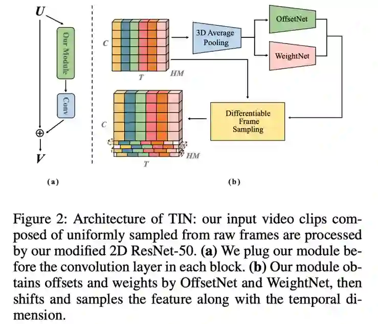 时序交错网络的框架如图二所示,该框架主要由偏移预测网络,权重预测网络和可微时序移动模块组成。其整体将作为一个模块插入到 Resnet 的卷积层之前。